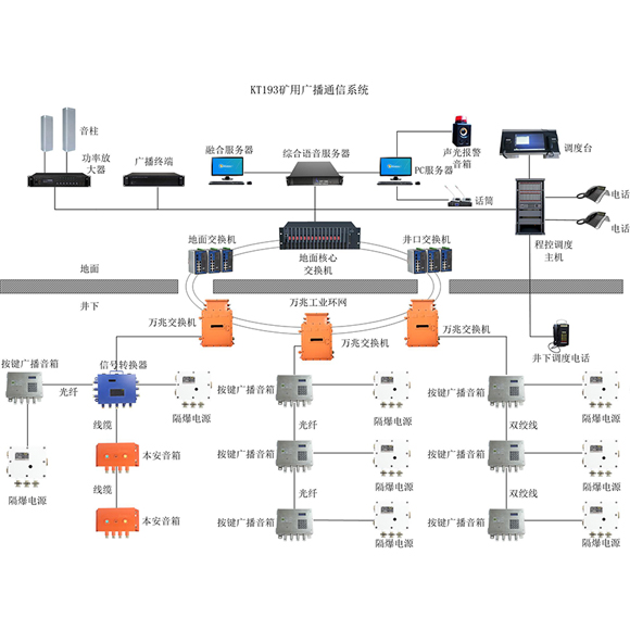 煤礦廣播通信系統作為現代礦山井下安全避險六大系統之一,當煤礦出現突發安全情況時,可作為指揮調度的輔助手段,在井下發生緊急情況時,可作為應急指揮的重要工具,地面調度指揮中心人員可利用廣播設備在大功率、受話半徑大的礦用防爆音箱等廣播設備,以擴音廣播喊話的方式對井下事故現場進行疏散和指揮,通過下達安全指令、全程指揮快速指揮井下人員及時逃離危險區域,從而有效地指導人員進行安全撤離,減少事故對作業人員的人身安全影響。 山東新云鵬KT193煤礦廣播通信系統能夠覆蓋井下的各個區域,進行音樂、新聞、報道、通知等的廣播,豐富作業人員的文化生活,加強其安全生產意識,通過以太網將數字音頻信號傳輸到井下的音箱,音箱將音頻信號進行放大播放。同時在地面與調度系統進行對接,利用原有線路資源進行組網,實現宣傳廣播的播放。